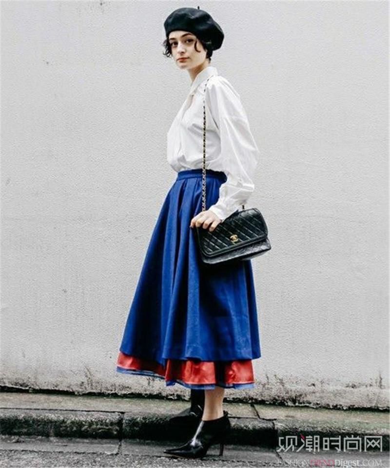 白衬衫搭配蓝色伞裙,经典简约的款型设计也能穿出优雅灵动的美感。蓝色裙子选择使用砖红色内衬,使得整体造型不再显得单薄。