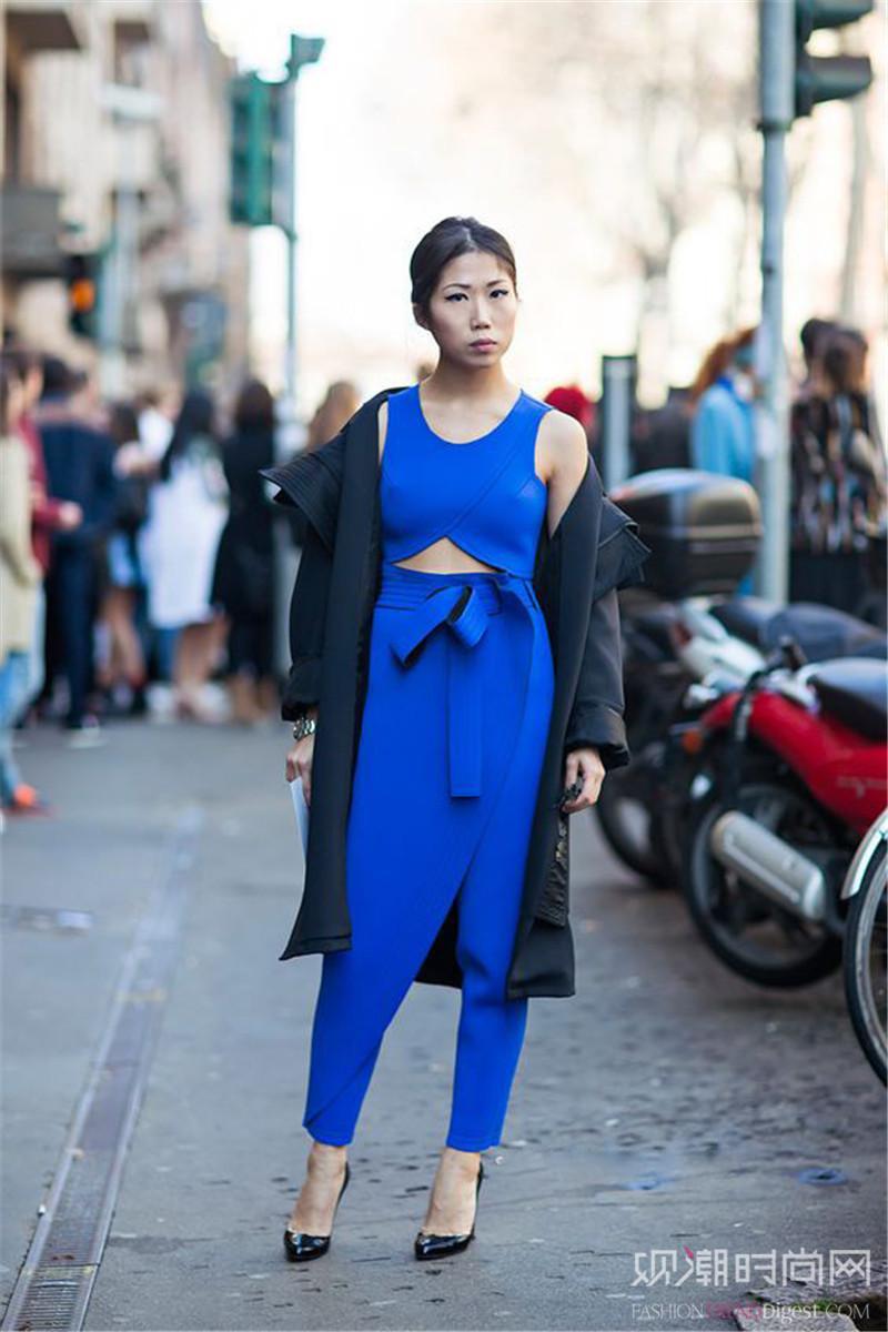 经典又高级的蓝色系穿搭非常有女王范的气概,高饱和度的衣着风格有着超强的显白效果。