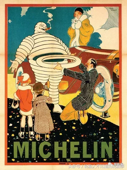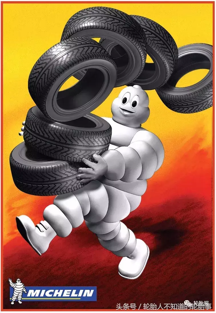 米其林已经脱离了1898年海报艺术家奥伽洛最初创造的邪怪形象,进化成为今天的时尚、愉快的人物。在他身旁出现了轮胎制造商的文字标识。