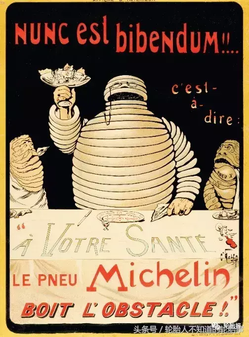 奥伽洛1898年4月第一份展示比必登形象的海报。“干杯”翻译成“现在是喝酒的时候……也就是说:祝你身体健康。米其林轮胎饮尽一切障碍! ”他们的想法是米其林轮胎能喝掉 “它们面前的任何障碍物”——比必登高举的酒杯里盛满了玻璃碎片