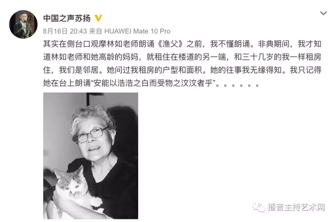 而林如老师的播音风格,在姚喜双教授32年前发表的《林如播音风格浅探》一文中,被概括为“以质朴含蓄见长”。微博网友@·张十二·就读武大播音系,在他看来,“我喜欢老艺术家,喜欢他们的作品,没必要故意使用华丽的技巧,也不必去虚张声势,开口就是满满的诚意。作品是让人舒服的,如果你什么都不思考,语流就如一缕清泉缓缓流淌。”