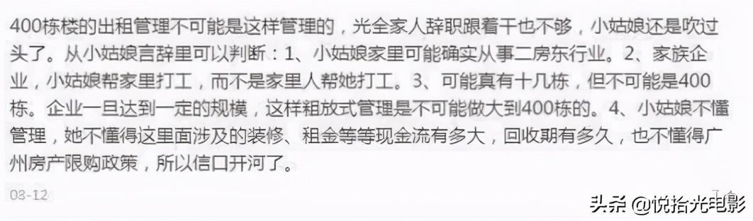 400栋*50万/月=每个月收租2亿,一年23亿???我跟网友有着同样的质疑:女孩是否家族企业,只是帮着家里打理?这样松散的管理能否配得上这么大的盘子?广州限购女孩怎么这么多套?