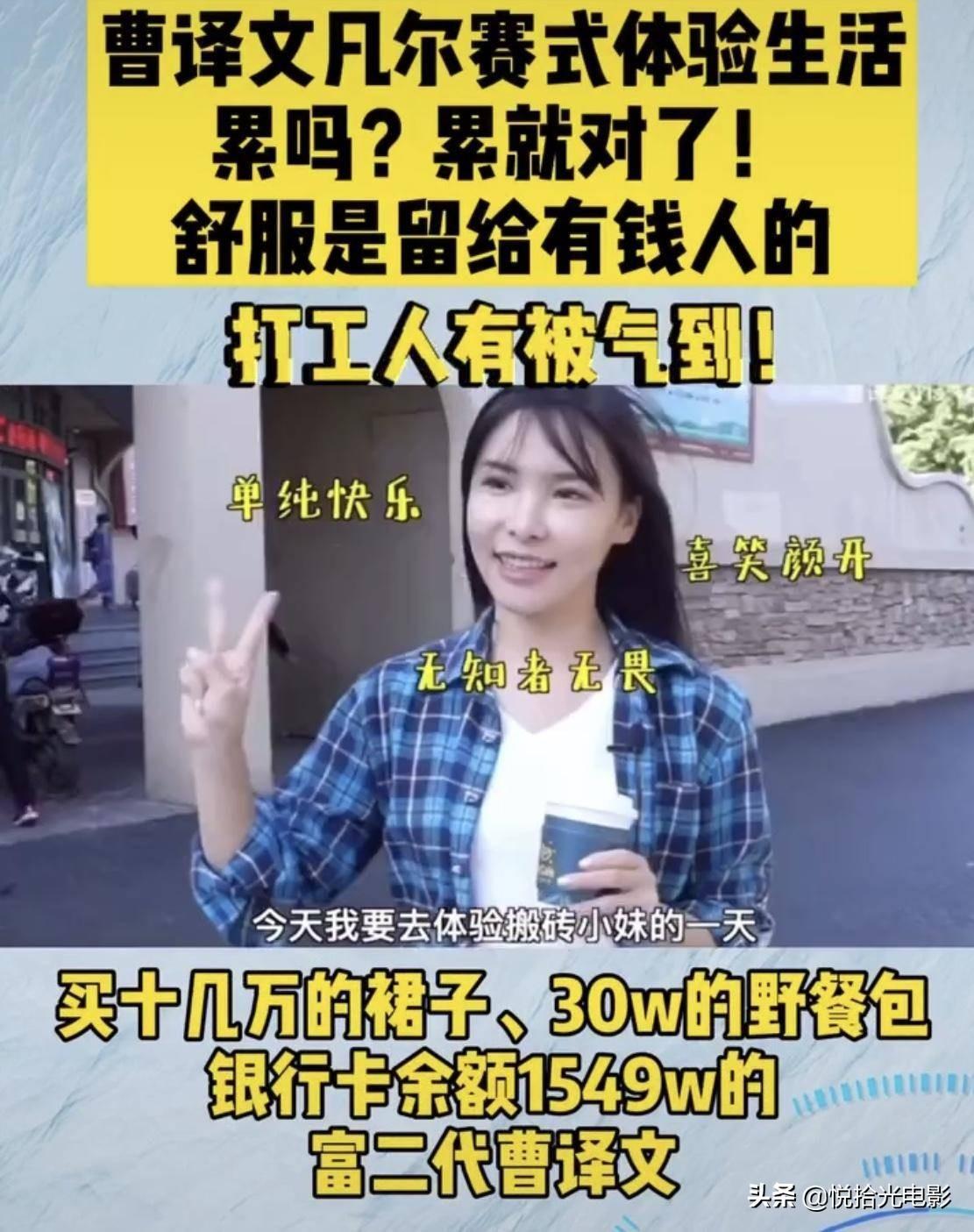 曹译文是一枚小网红,在自己的社交平台上上传了一段视频,标题是《累么?累就对了,舒服是留给有钱人的》,在视频最后炫耀了一把“有钱人”的身份。