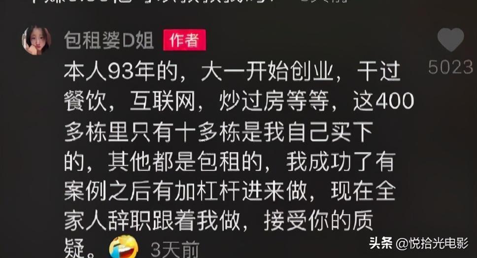 面对质疑,女孩解释自己大一就开始创业,餐饮、互联网,炒过房全都干过,这400栋里只有十多栋是自己的,包租+杠杆操作,才有今天。