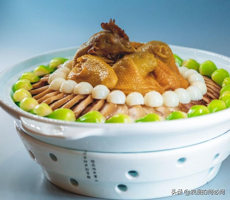 这道菜是比较油腻的,但是好多人喜欢。金银蹄鸡,顾名思义是用金华火腿、猪蹄、母鸡烹制而成的。古人称火腿为“金蹄”,猪蹄为“银蹄”,因而得名。据说它是从苏州菜“金银蹄”发展而来的,因为金银蹄虽滋味肥厚,香酥入味,但油腻过重,鲜味不足,所以徽州菜厨师再加进母鸡,一起和金银蹄入砂锅爆煮,结果使它的口味变得又肥又鲜,成为冬令的名菜,不但是创新,也是发明。