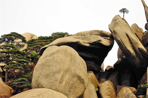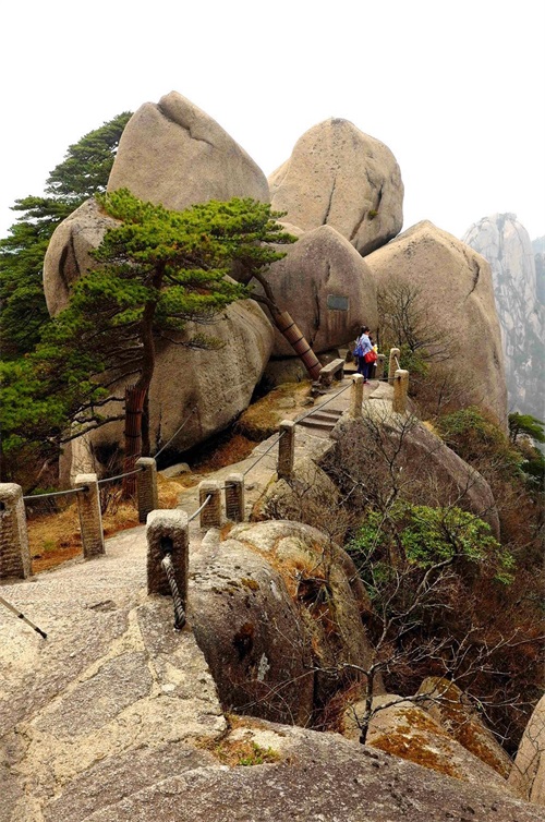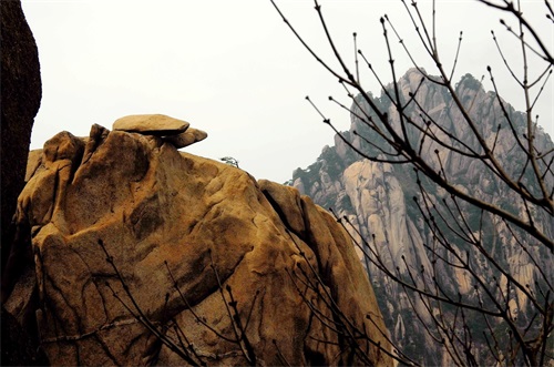 这就是组成天都峰著名的奇石“松鼠跳天都”的那两块石头。从背面看无太出奇的地方。