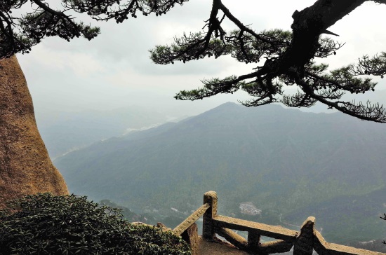 这地方看玉屏峰太经典啦,前面那红顶房子就是玉屏峰,迎客松就在那里,后面是莲花峰。
