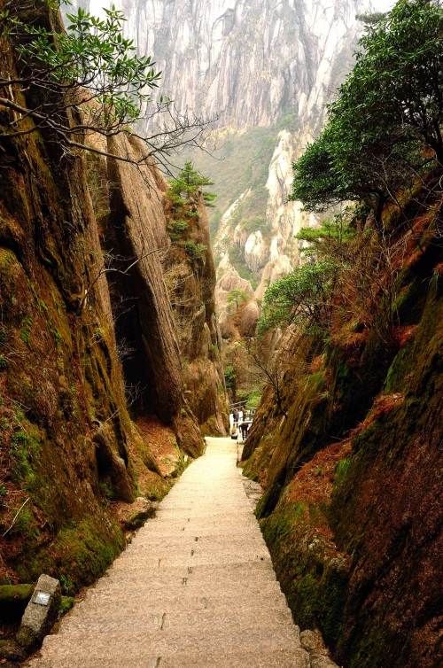 对面上天都峰的路蛇形蜿蜒,依稀可见,看来今天上去的人不少。