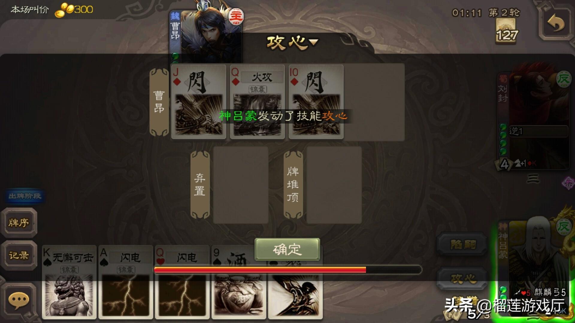 三国杀的一个趣味性在于,你不知道对方的牌是什么,很多时候要去猜,要去想,但是和神吕蒙打,画风就会变得非常清奇,你们都是明牌在打……明牌是什么概念,就是所有的一切我们都心知肚明,技术流基本上就瓦解了,输赢看摸牌能力和手牌的质量。但是试问整个三国,优于涉猎的摸牌技又有几个呢?