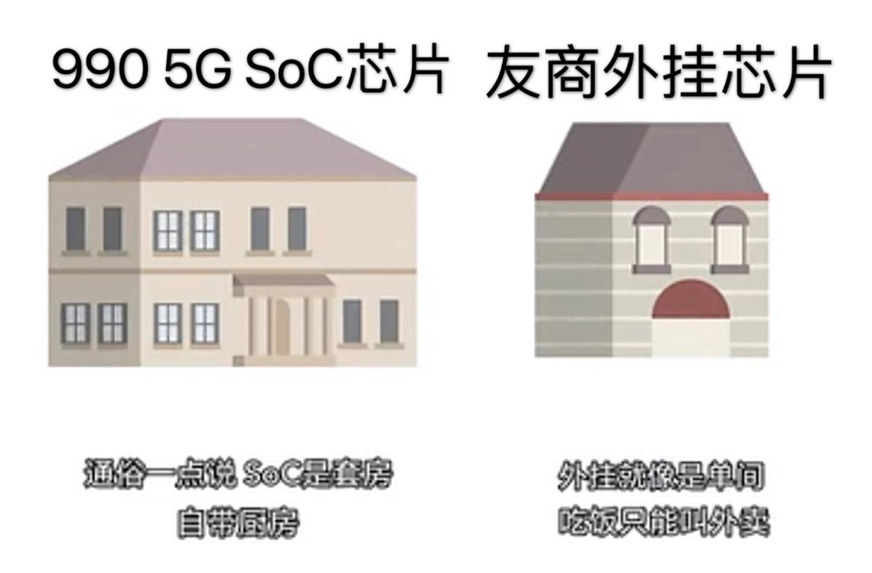 这里我们以麒麟990 SoC与骁龙865为例进行讲解,SoC与外挂芯片的差别在于,SoC的AP(应用处理器)与BP(基带)集成到一块芯片,而外挂的AP与BP则分离为两块芯片。因此,SoC相比外挂芯片较外挂体积更小,更节省空间且功耗更低。打个形象的比喻,SoC相当于自带厨房的套件,外挂则是单间,吃饭只能叫外卖,哪款芯片更适合一看便知。