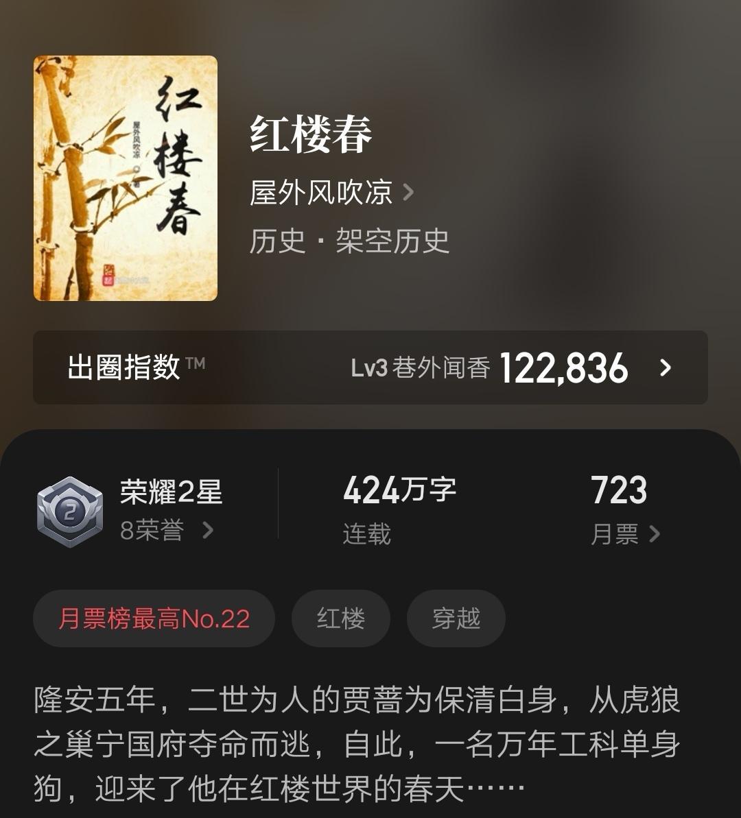 不得不说写穿越红楼的书不少,但穿越成为贾蔷这个人的书还是第一次看到。作为写红楼文的老作者,凉风吹的笔力很有保证。书中各种人物关系与矛盾点在符合元素逻辑的同时,作者的发挥也让人觉得很有道理。书中人物可信,剧情合理,因此这本书可看度极高。