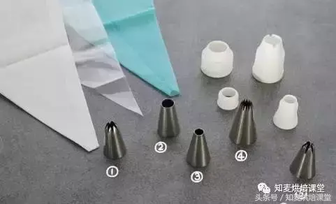 2、裱花袋:包括最常用的一次性塑料裱花袋、适用于较硬面糊(如曲奇、泡芙面糊)的布裱花袋和硅胶裱花袋;