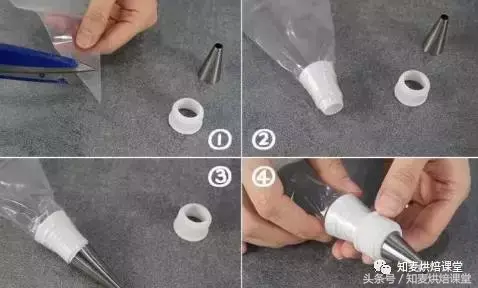 剪口后装进转换器底座;裱花嘴从外面套上底座,套上转换器的头,旋紧。