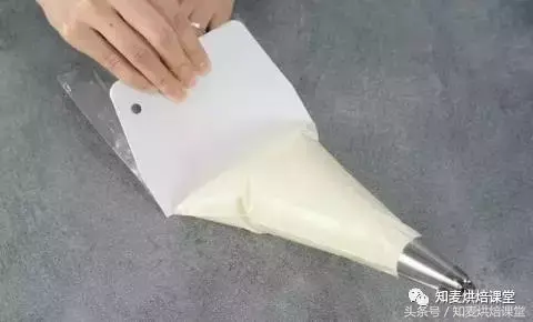 4、将裱花袋反折的部分翻回,提着两边抬起裱花袋,放在桌子上;松开裱花嘴处扭起的裱花袋,把肉眼能看见的袋中的大泡隔着袋子轻压推出;用刮板隔着裱花袋将填充物推压到前端,直到填充物从裱花嘴中冒了个头;注意:填充物不能超过裱花袋体积的2/3。