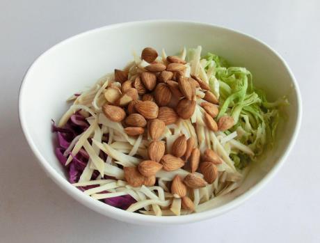 夏日餐桌上,一份美味的凉拌菜,清凉爽口,开胃下饭,人的食欲瞬间也会被打开,吃饭香,我们平时吃的许多种蔬菜,都是可以做成凉拌菜的,有可以生吃的,也有需要白灼的,再将处理好的食材合理搭配在一起,便做成一份美味的凉拌菜,这次分享给大家的是一道杏仁三丝,是用杏仁搭配紫甘蓝、绿甘蓝和杏鲍菇做成的,其实凉拌三丝是很多人都会做的一道家常凉拌菜,完全可以根据自己的喜好来搭配,菠菜、西芹、木耳、豆腐丝等等皆可。