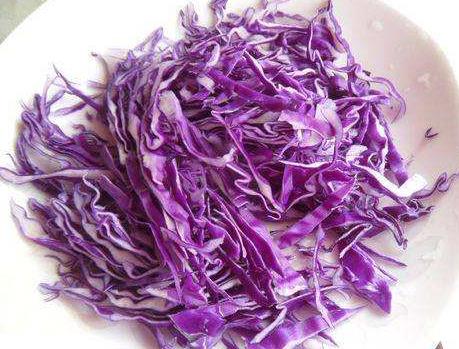 第四步,紫甘蓝和绿甘蓝,取需要的量,清洗干净后,切成细丝,一同放在盛有杏鲍菇的碗中;