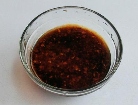 第五步,一个干净的小碗中,放上盐、香醋、生抽、蚝油、糖和红油,搅拌均匀成料汁;