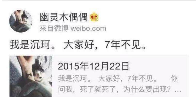 而在15年,沉珂突然在微博上出现,ID为“幽灵木偶偶”,并且发了一篇长文,文中写了她从08年消失到现在,这7年都发生了什么。其中,也澄清了很多当年污蔑自己“做小三”“出国打胎”等等负面能量的谣言。