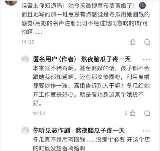 还有网友说冬瓜当初为了爱情和沉珂在一起,如今变得现实了,就要和沉珂离婚了。