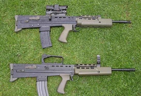 再来看看两种英国SA80突击步枪的对比,上面是以光瞄为主,下面是以机瞄为主,可以看到光瞄为主的SA80同样采用了高破天际的增高桥,同样的一个问题,增高桥下半部分和枪身连接,上半部分和瞄准器连接,三次连接可靠性怎么样,各种冲击造成连接器变形怎么办,这些都是问题。