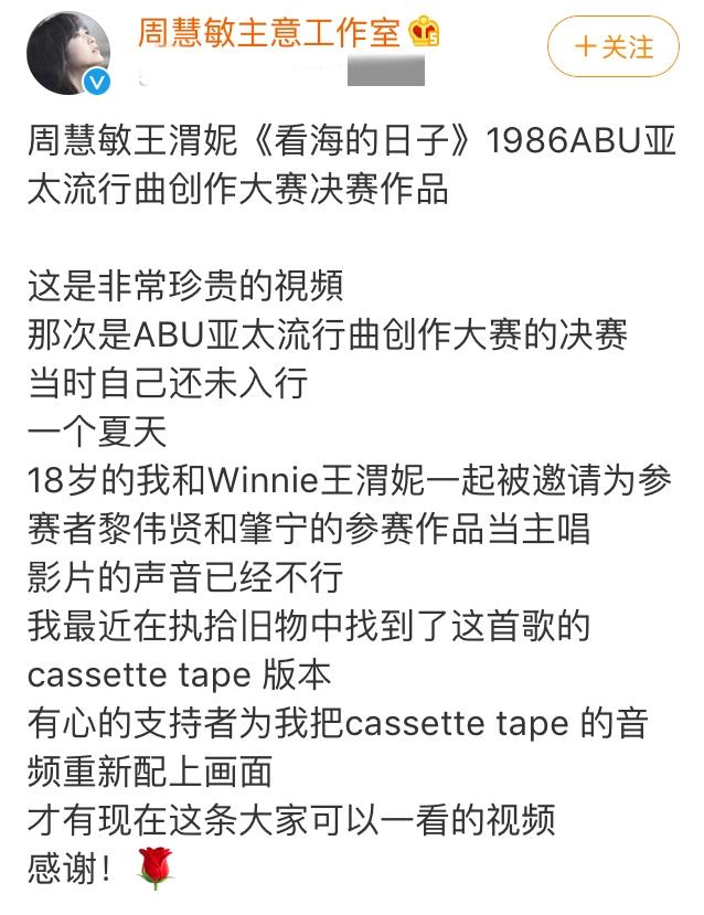 晒视频的同时,周慧敏还配文交代了这段表演的年代背景。原来这是她18岁时参加选秀决赛时的表演作品,视频中和她一同演唱的女孩名叫王渭妮,她们所唱的歌曲名叫《看海的日子》。