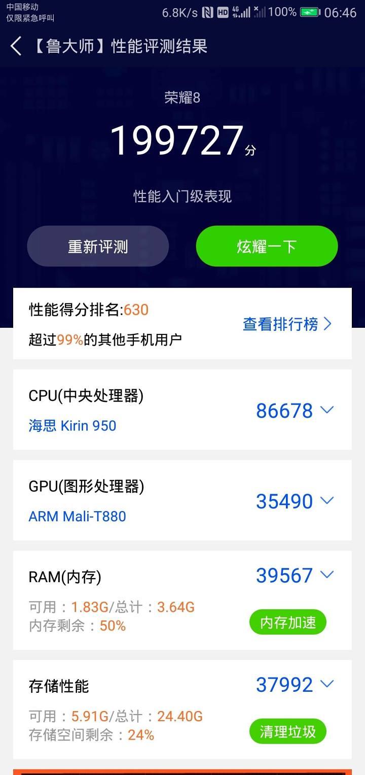 经过几天的把玩,我特意用鲁大师给荣耀8做了一次全方位多角度(划掉)的性能评测,结果如下: