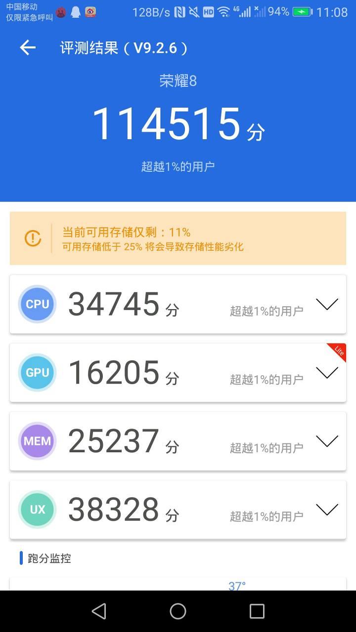 因为荣耀8似乎并没有性能模式开启的选项,所以无法得出其在性能模式下的跑分,但32G内存放到现在,基本可以劝退玩儿王者荣耀和和平精英的玩家了。