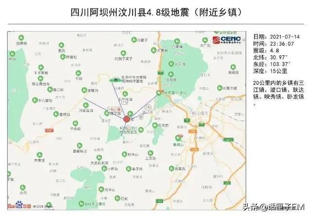据中国地震台网测定,7月14日23时36分在四川阿坝州汶川县(北纬30.97度,东经103.37度)发生4.8级地震,震源深度15千米。