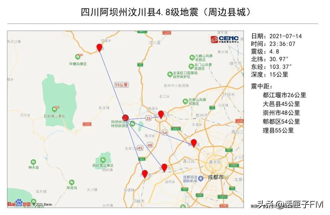 据四川省地震局消息,震中距都江堰市26公里、距崇州市48公里、距成都市76公里。