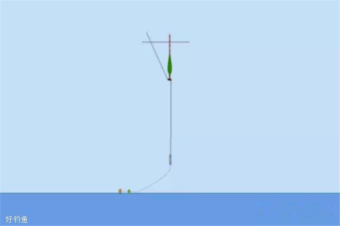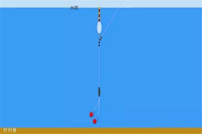 双钩挂饵也是野钓中常用的调漂方法,可以钓底也可以钓浮。是实用而且可以调整出状态最多的调漂方法,从钓浮到单饵触底,再到双饵触底,各种状态都可以调整出来。过程如下,粗找底,调整到双钩离底,挂上双饵,修剪铅皮到浮漂平水(如果钓浮就修剪到浮漂露出1、2目,此时也可以钓底,而且可以调整出多种状态),然后找底钓1、2目。