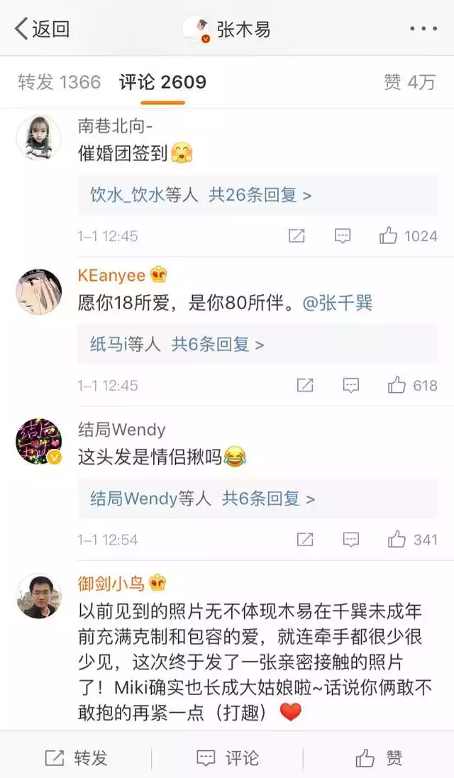 粉丝留言为二人送祝福:有一种爱情 叫做你们!初中喜欢你们的勇敢爱 我大学了,你才17 ,好好的!从你唱了imagine me without you开始关注你, 喜欢你们的时候应该才初二吧 ,现在已经大一了, 看着木易默默守护着你等你长大, 现在终于到了能结婚的年龄了, 感觉你们真的很美好!希望你们能一直幸福下去!