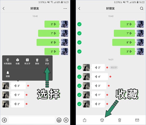 如果转发的语音条数比较多,我们也可以长按微信语音,点击「多选」,勾选需要转发的语音,点击下方「收藏」图标,所有语音都被批量收藏在一起了。