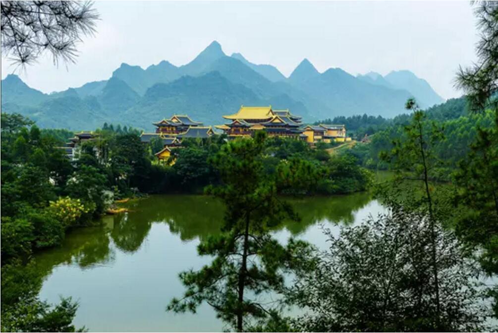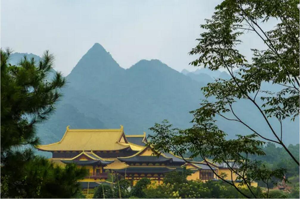 如今,莲音寺的黄色琉璃瓦在阳光下熠熠生辉,朱门庄严,香烟缭绕;金莲湖畔屹立着五棵千年金刚菩提圣树,象征着无量的智慧、无量的善缘、无量的佛光,普照大千世界。
