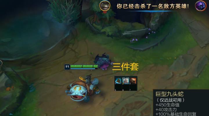 在装备上,出门装带腐败药水,可以很好的打消耗换血,要提高塔姆前期清线方面,前面可以出一个提亚马特,有比较强的清线能力。再直接出巨型九头蛇,可以打出更多的输出伤害,整套装备(水银鞋+巨型九头蛇+亡者板甲+羊刀+适应性头盔+狂徒铠甲),当然这是顺风准备,逆风就把羊刀改成日炎斗篷就好了。