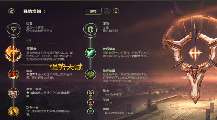 在天赋上主系上带(征服者+凯旋+传说:欢欣+致命一击)副系坚决带(护盾猛击+骸骨镀层)这样带天赋塔姆可以打的很猛。