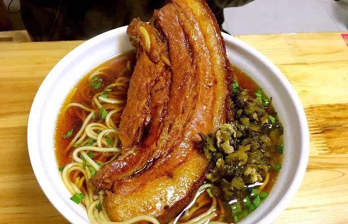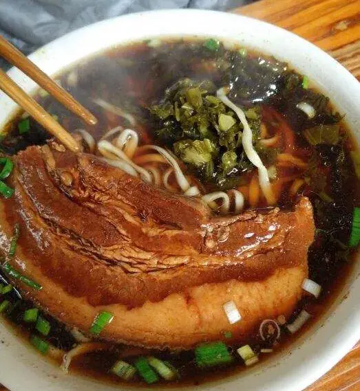 面条200克,烧好的大肉,酸菜、水发黑木耳、香菇片、油菜心各适量。
