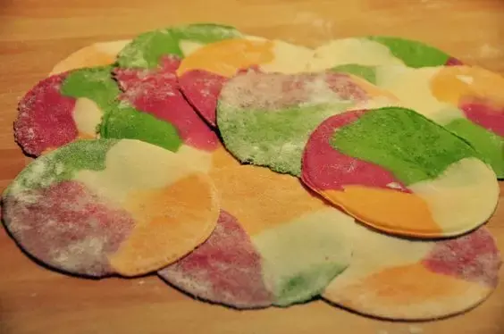 3.小面团用擀面杖擀开,就得到彩色面皮啦。