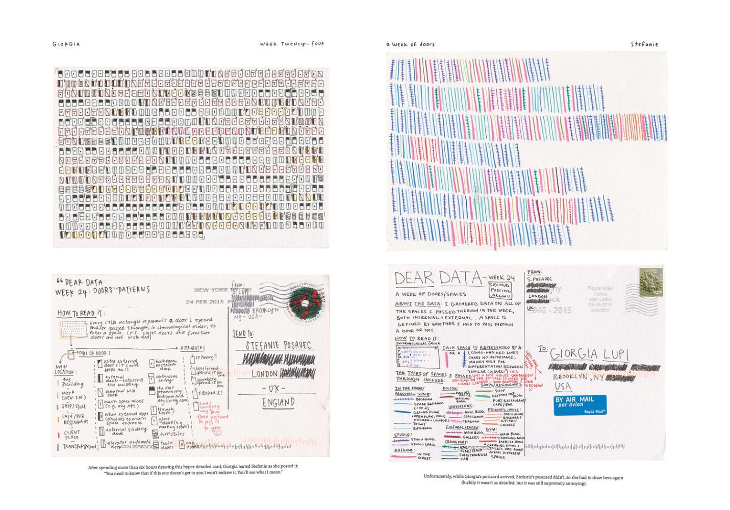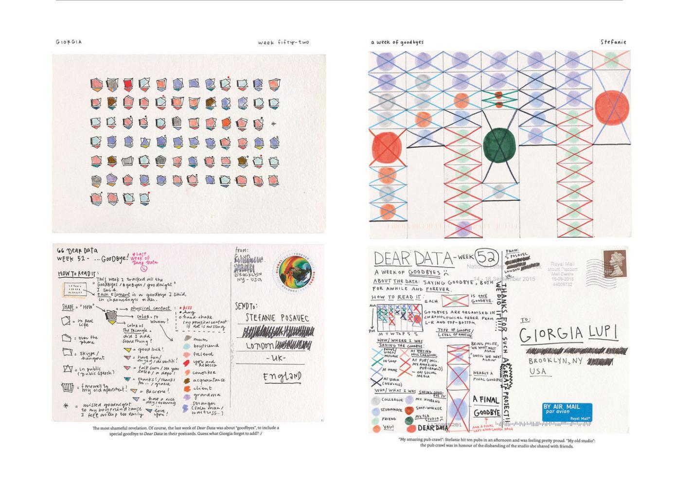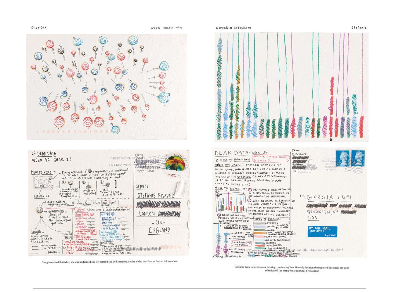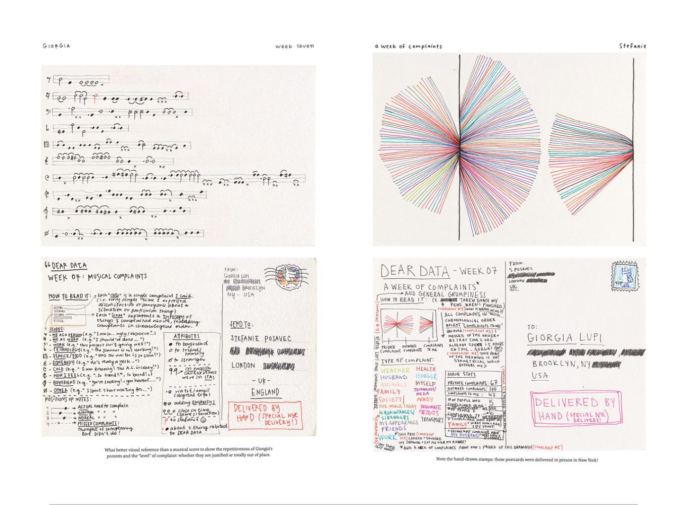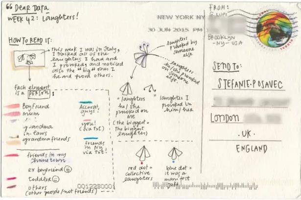 实际上,她俩一边在用手写的明信片分享各自的生活,另一边,这也是一个数据化的项目。该项目的特点是通过模拟的方式来创建和呈现数据可视化。设计师们通过捕捉生活中的重要内容,以“每周数据”的形式勾勒出一幅该周的生活图景。最终的数据都会写在明信片上,寄给作者的亲爱的朋友们。在数字化时代,作者用意为用这样一种有趣的方式纪录生活。由于我们处在数字化时代,生活中也处处包含着计数,运算和测量。 目前,俩人的明信片以及做成了书籍《亲爱的数据》。