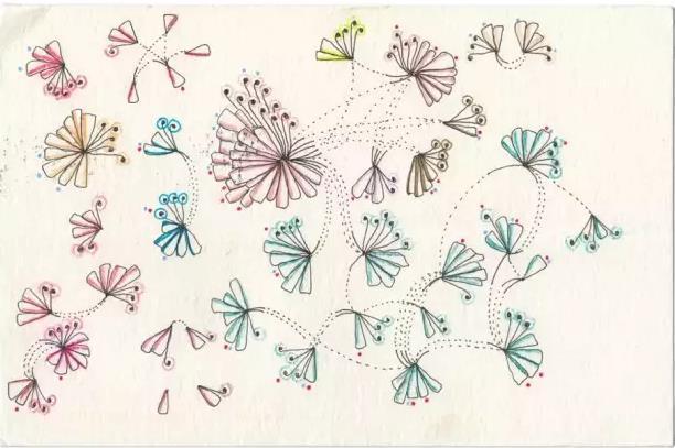 比如,这张图片是作者第42周的作品,主题是生活中令人开怀大笑的事,作者以花瓣为模型,每个元素都代表令她笑的人和事的各个细节,比如用不同颜色展现不同的人,浅橙色代表男朋友,蓝色代表纽约的朋友,浅粉色代表她寄明信片的朋友。