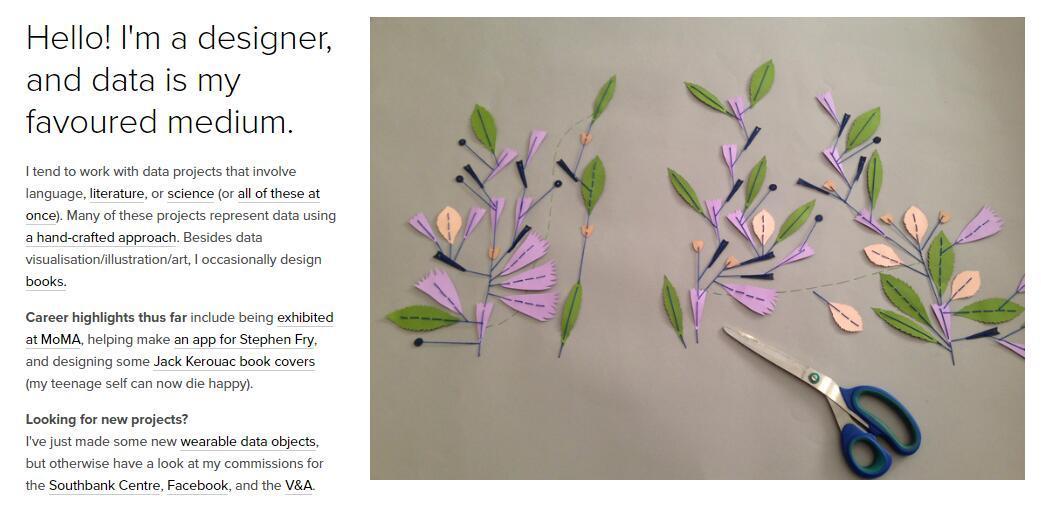 2004年,故事的另一位主人公Stefanie从美国的科罗拉多州丹佛市到伦敦,攻读传达设计硕士学位。同时,她是一个屡获殊荣的设计师,她参与的项目从数据可视化到信息化设计。她个人的工作重点从语言,文学,科学主题衍生,往往采用手工制作方法表示数据的可视化。她的这项工作已在全世界主要的画廊,比如纽约博物馆国际上展出。