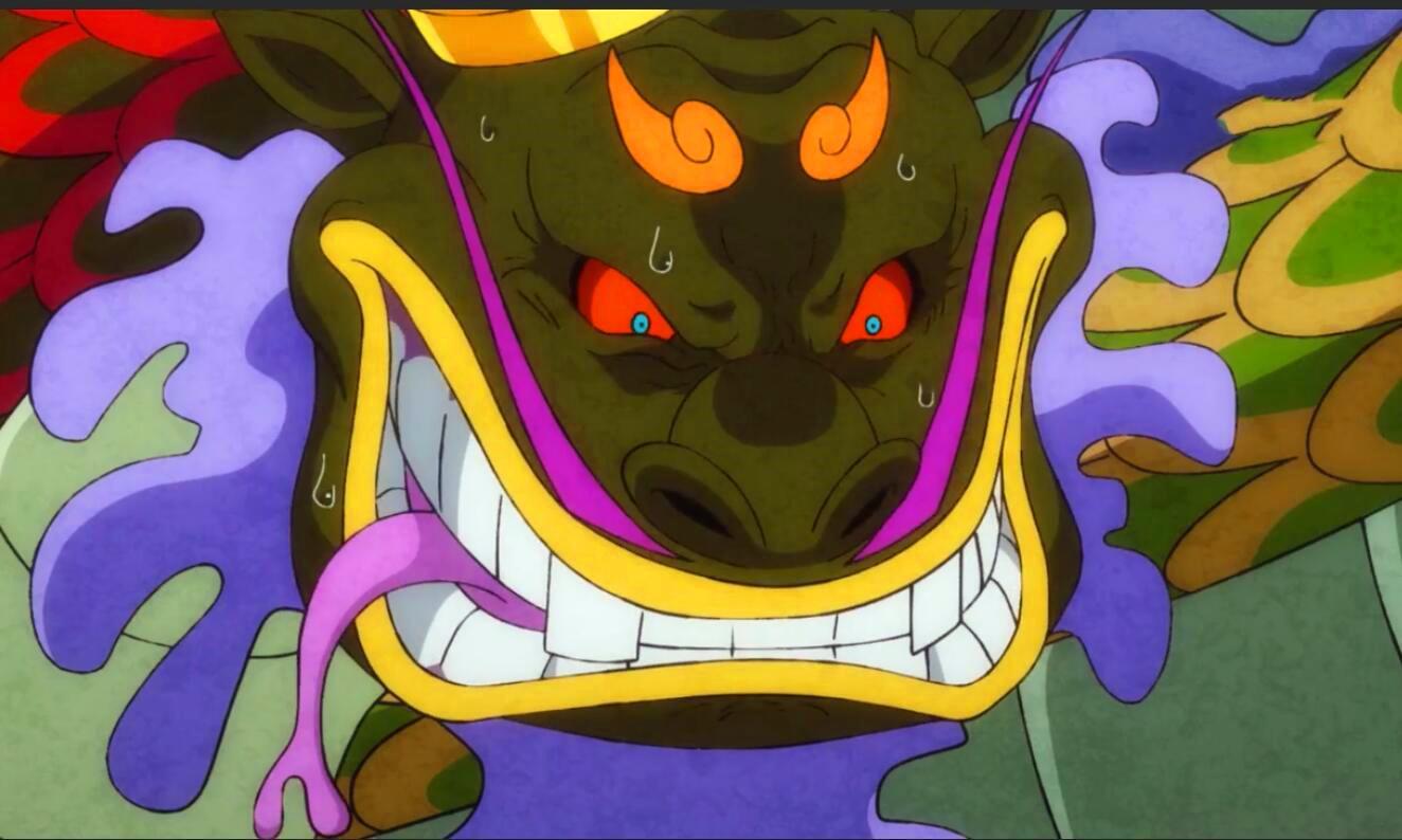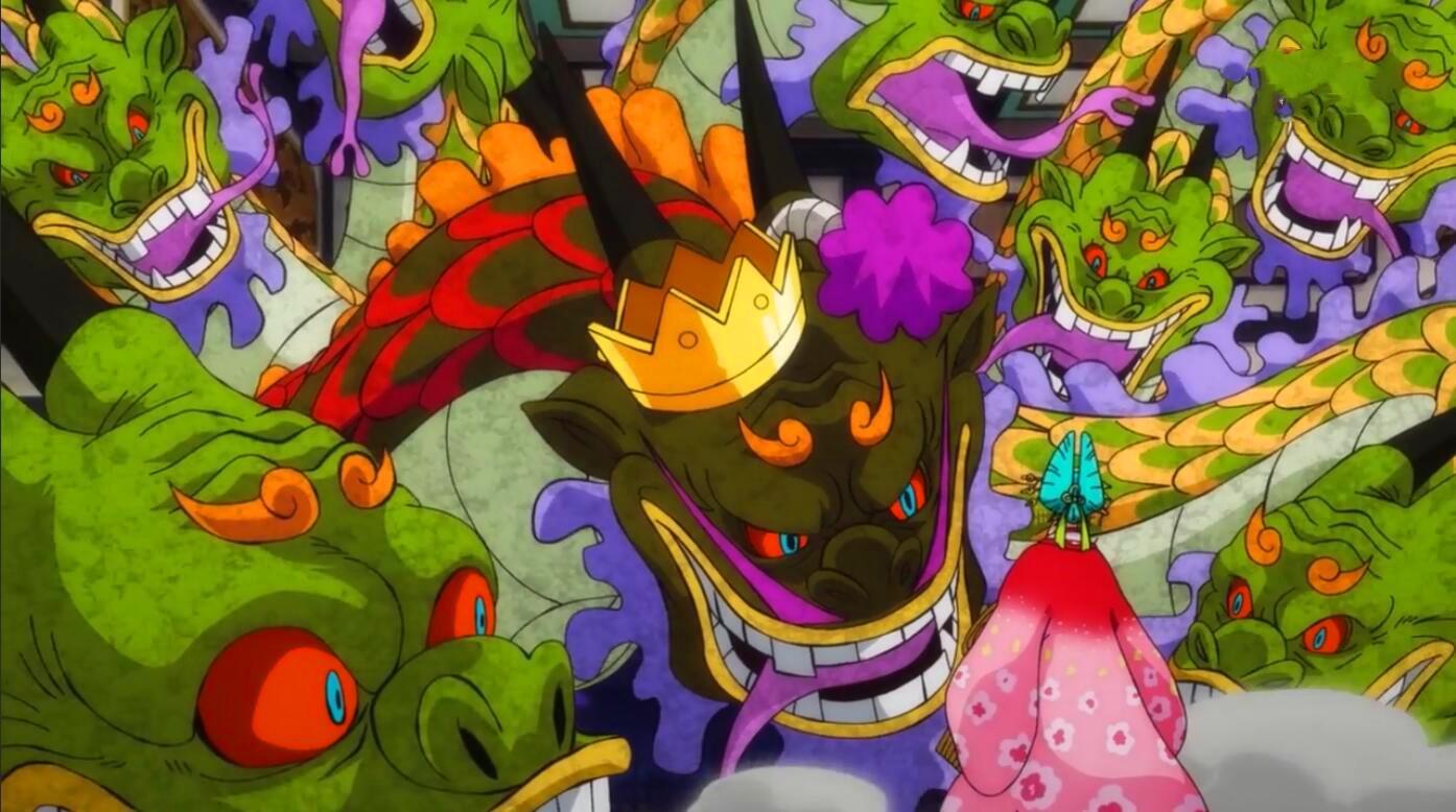 先说大蛇首次正面展现的兽形态,这也是第一次对大蛇的恶魔果实进行了详细说明,证实了他是动物系中较为稀有的幻兽种恶魔果实,纵观整部作品也是寥寥无几(不计算番外),战国的人人果实·大佛形态、马尔高的鸟鸟果实·不死鸟形态、戴彭的犬犬果实·九尾狐形态仅此三例,而大蛇的蛇蛇果实·八岐大蛇形态则是第四个,可谓极为罕见。