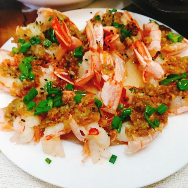 把你做好的蒜蓉酱均匀的铺在蒸好的虾子上,再撒上一些葱花,拿一口新锅烧热两小少油,(油冒烟了就可以),浇在你的大虾上面,激发葱蒜的香味,然后就上桌开吃~这几个步骤在做的时候来不及拍照了,对不起大家了,但是你们一定懂我的对不对~