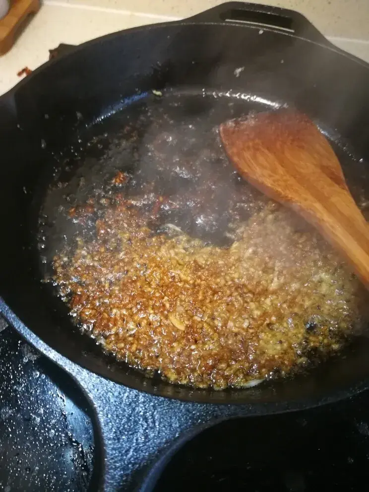 香味出来后倒入剩下的一半蒜蓉,混合均匀,整个过程时间很短,不要太久,蒜蓉很容易炒糊,会变得很苦