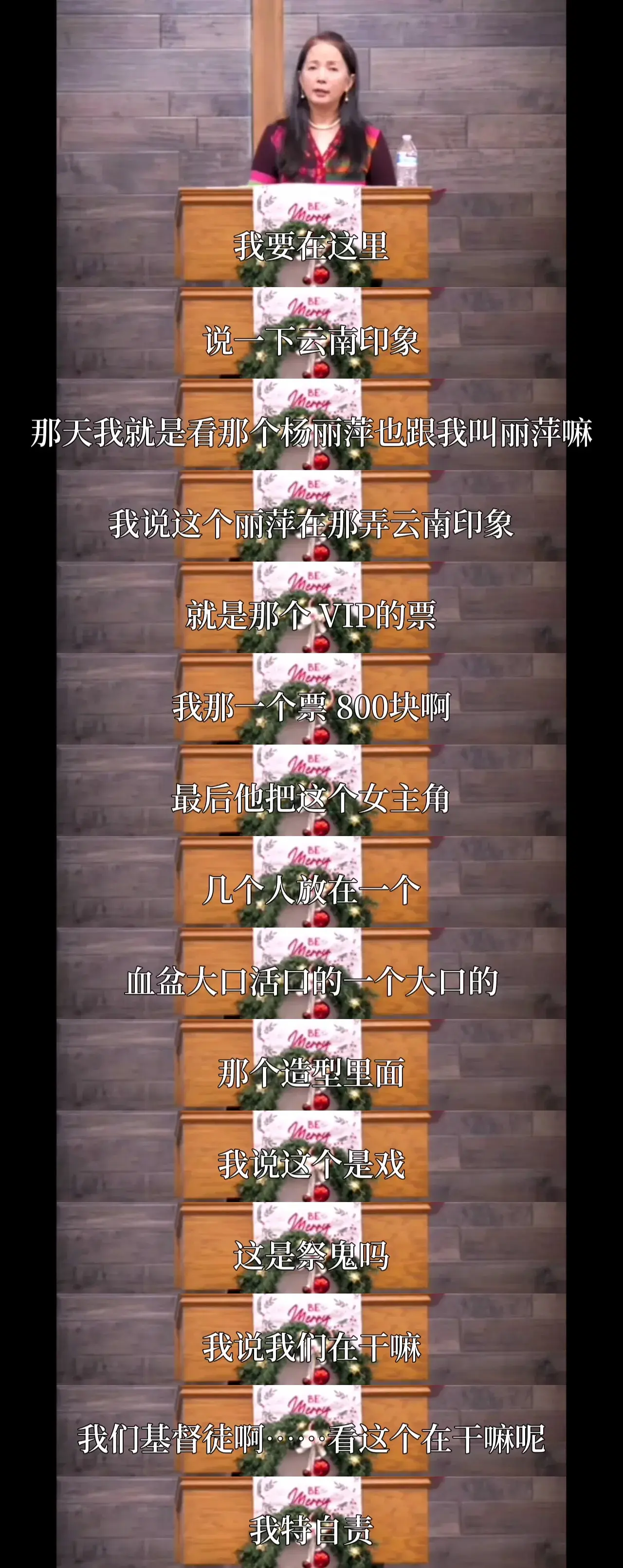 “我和海英在零九年的时候非常忙碌,那时候的戏剧工作一个接一个,忙得连脚都沾不了地。每天都是这样,我们两个都忙得不可开交。有一天,我看到杨丽萍,她也叫丽萍,她说她在准备云南印象的演出,他们给了我们两张VIP票,每张票价值800元。我们坐下来观看,孙海英都睡着了,我感到很无趣。我看着舞台上的表演,看到云南的少数民族在舞台上展现出他们的朴实和美丽。然而,最后的效果却让我感到困惑。他们把女主角和其他几个人放在一个大嘴巴里,这个嘴巴是活的,造型非常奇特。他们被送到这个嘴巴里面,我觉得这个场景很诡异。我在想,这是在祭鬼吗?我和孙海英作为基督徒,看这个干什么呢?我感到非常自责。我看到舞台下有那么多欢呼的人,他们都不知道这是怎么回事。我看到这样的表演,虽然不是嫉妒,但孙老师都睡着了,这真的很有趣吗?”