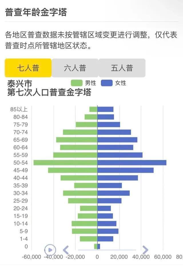 对照七普年龄金字塔我们还能发现一个有趣的现象,40-59岁的壮年劳动人口中,男性人数明显少于女性人数,具体到每一个年龄段女性都比男性多出不少,一共多出了一万一千多人,占到总人口的1%左右,占40-59岁总人口的5%左右,男女比例比较失调。不过,这个年龄段的男少女多现象也不难解释,具体原因如下:这个年龄段的人口在应该接受教育的时候国家遇到了一点困难,教育事业停摆了一些年,因此这个年龄段的很多人并没有接受良好的教育,只能以卖力气为生,尤其是男性。而泰兴作为一个小县城并没有那么多的工地或者体力活的需求,所以他们当中有不少人选择去附近的上海,苏州或者南京这样的大城市打工,靠自己的辛勤劳动谋生。