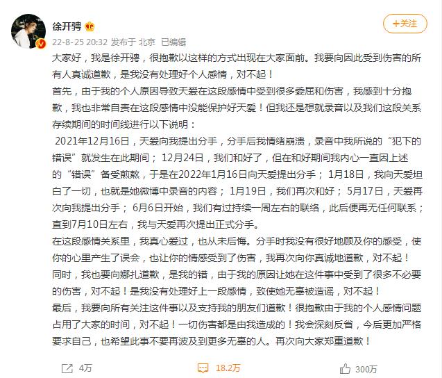 在录音中,徐开骋称自己酒后乱性,对不起张天爱,痛哭道无法接受这样的自己:“我没有办法保护你,所以我特别恨我自己。”录音中还提到了恋爱合约不能曝光恋情等内容。