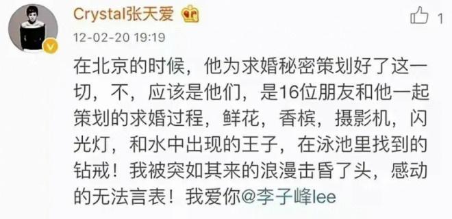 张天爱和李子峰早在入行之初就相互陪伴,颜值上十分匹配的小情侣成为了周围人羡慕的对象,甚至在2012年时,李子峰还精心策划了一场求婚,在诸多好友的见证下向张天爱成功求婚。爆料称,二人当年分手的原因是男方认识了比张天爱条件更好的女人。在秘密进展差不多的时候,李子峰便抛弃了张天爱。