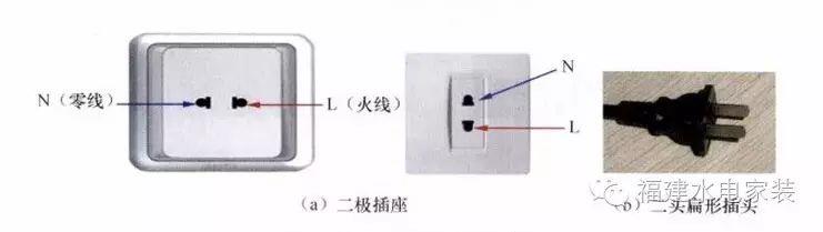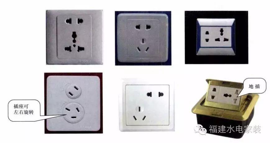 几种家用86插座如图下所示,从图示可以知道插孔分为圆或扁的区别,我国推行扁插插座系统,圆孔插座在市场上面临淘汰。因此,选用电器专用的86插座应选购两极扁圆孔插座或三极扁孔插座。两孔插座有火线与零线的两个接线柱,三孔插座有火线、零线和地线3个接线柱。如果两孔插座是水平安装时,通常规定接线方式是"左零右火";如果是立面安装则"左零下火";三孔插座则大孔接地,“左零右火”。