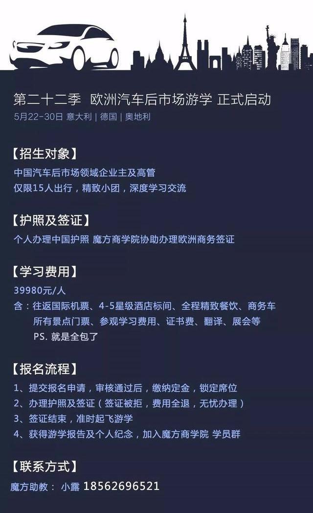 第二十二季魔方商学院汽车后市场欧洲游学现在就要开启了,下到总部给您一次零距离的接触!您是不是有点心动?抓紧来报名吧-----让我们一起粗发