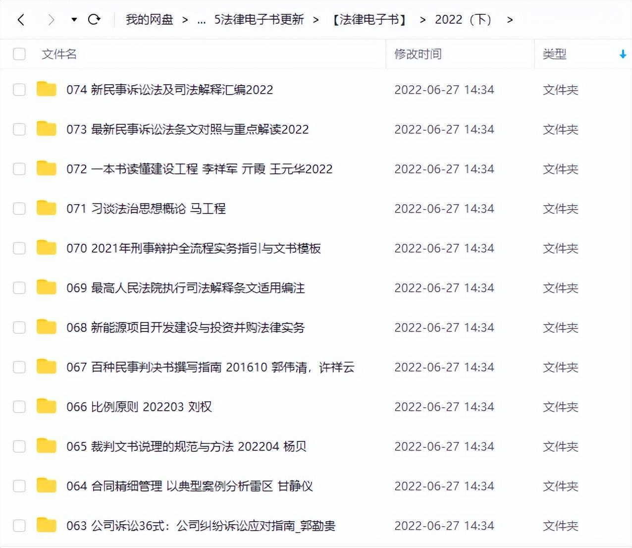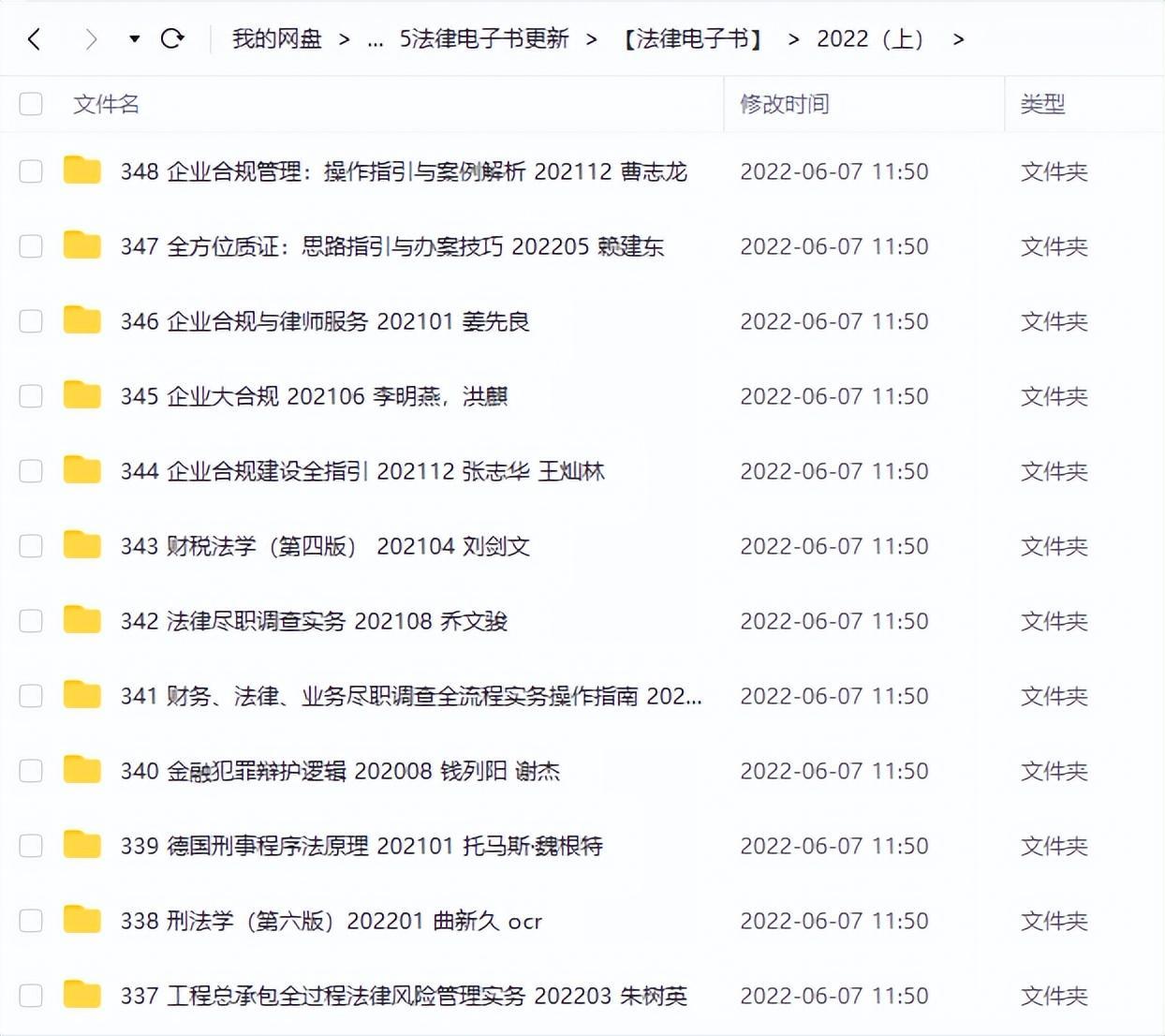 法律类实务书籍电子书分享,目前已有336G法律实务书籍内容(22年已更新410本书籍),共包含3864个文件和1768个文件夹。
